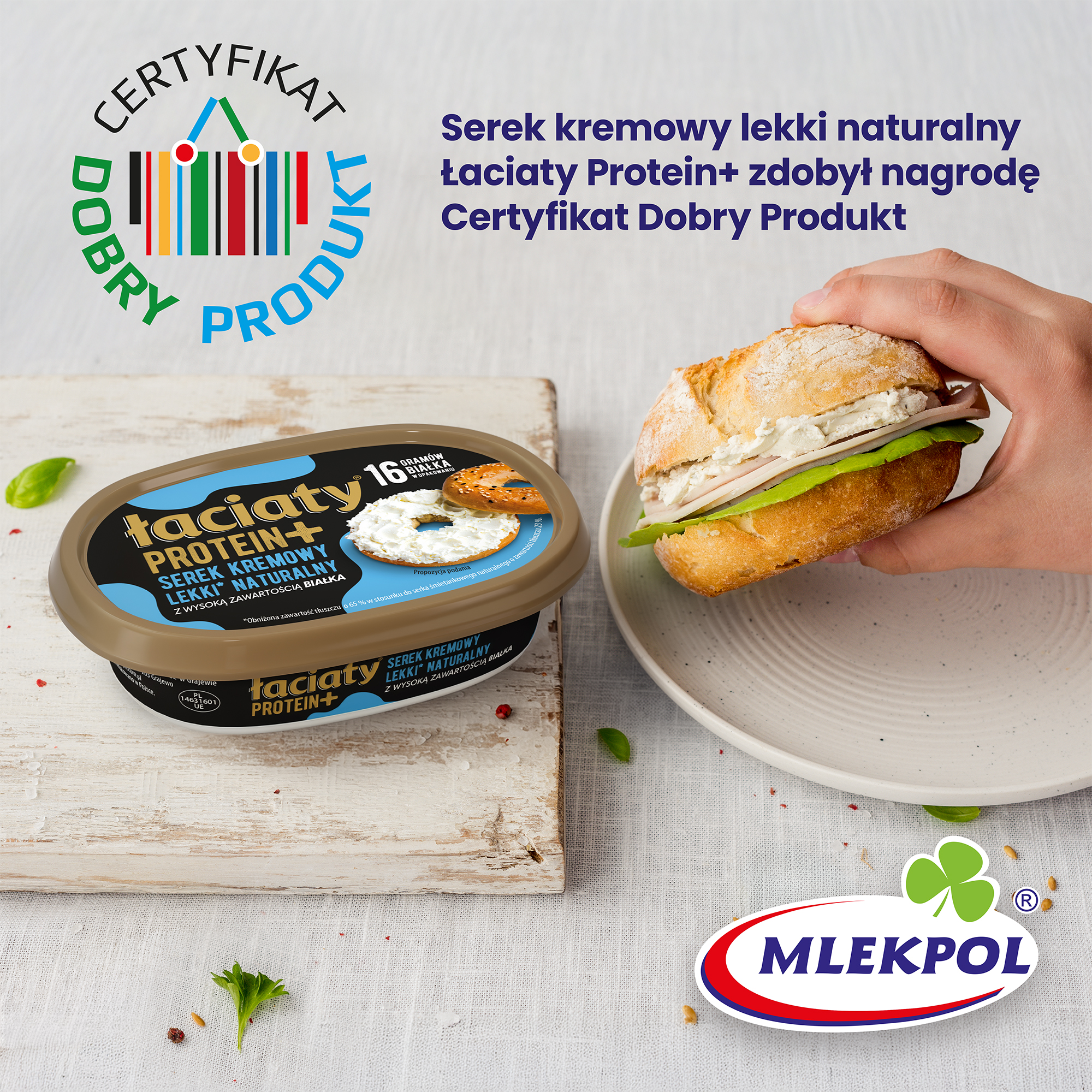 Linia produktów wysokobiałkowych ŁaciateProtein+ znów wyróżniona! Tym razem serek kremowy lekki naturalny Łaciaty Protein+ 135 g zdobył prestiżowy Certyfikat Dobry Produkt. Nagrodę odebrał Prezes Zarządu Spółdzielni Mleczarskiej Mlekpol Tadeusz Mroczkowski podczas uroczystej gali, która odbyła się 17 listopada w ramach Forum Rynku Spożywczego i Handlu w Warszawie.