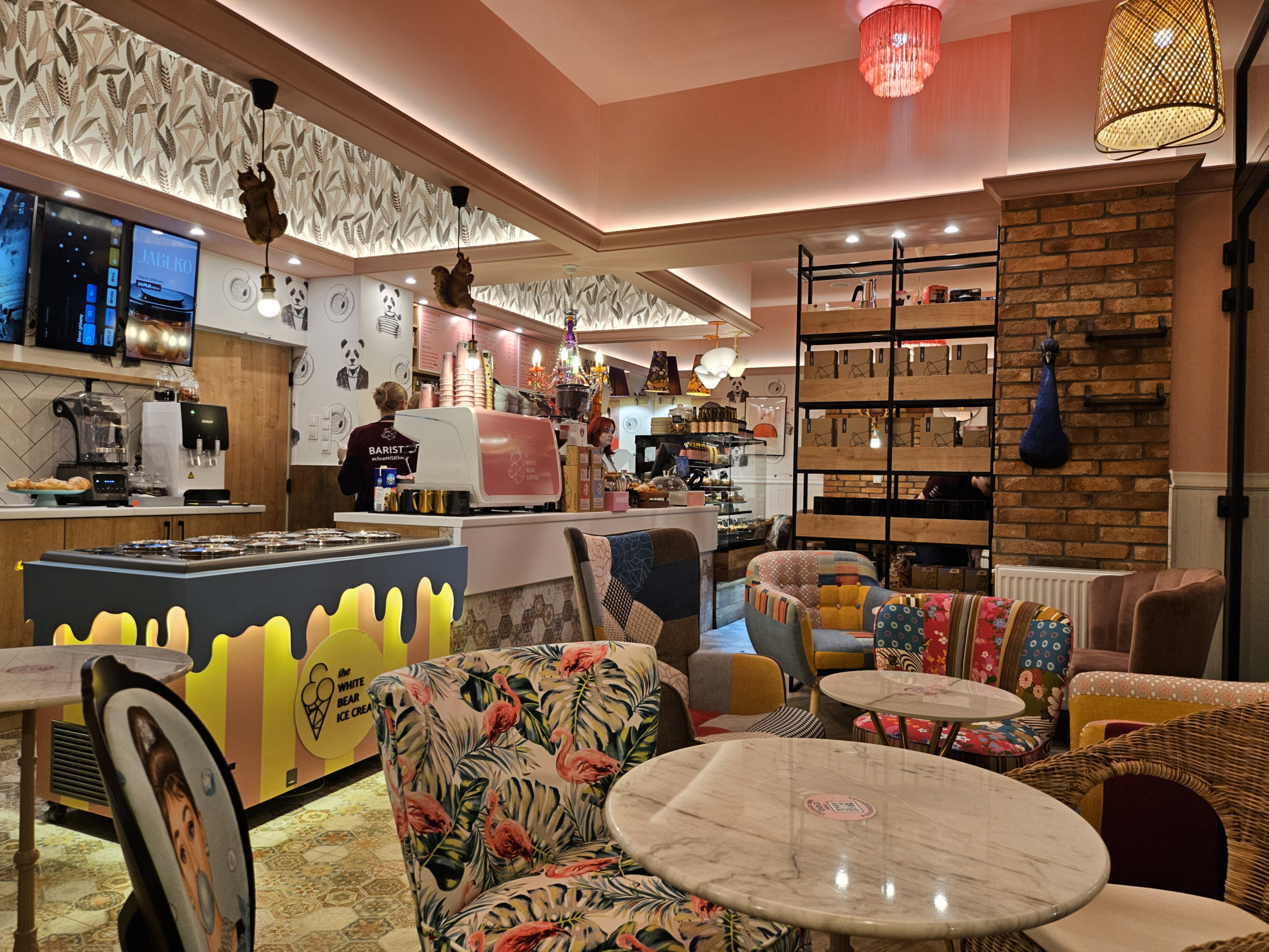 Nowa kawiarnia została zaprojektowana jako przyjazna, kolorowa przestrzeń, w której można zarówno wpaść po szybkie cappuccino, jak i spędzić kilka godzin z laptopem czy w gronie znajomych. Wnętrze łączy charakterystyczne dla sieci akcenty z elementami nawiązującymi do postaci białego niedźwiedzia - znaku rozpoznawczego marki.