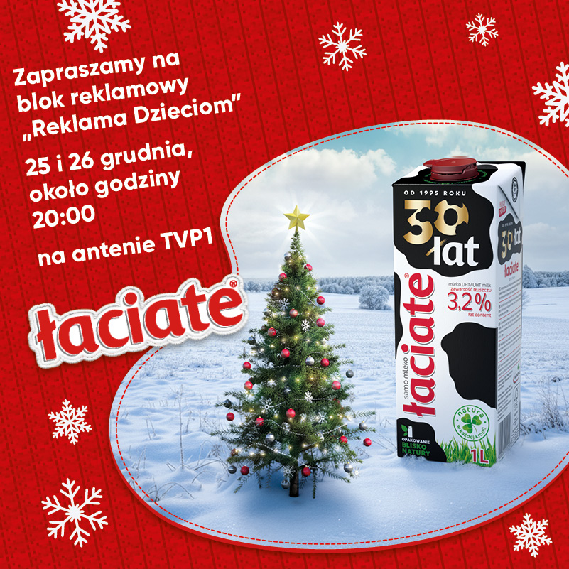 W tym roku świąteczny blok reklamowy zostanie wyemitowany 25 i 26 grudnia, około godziny 20:00, zaraz po programie informacyjnym „19.30”. Widzowie zobaczą spot „Ale się zeszło!” z okazji 30-lecia marki Łaciate oraz „Nowy w rodzinie", promujący twarogi Łaciate.