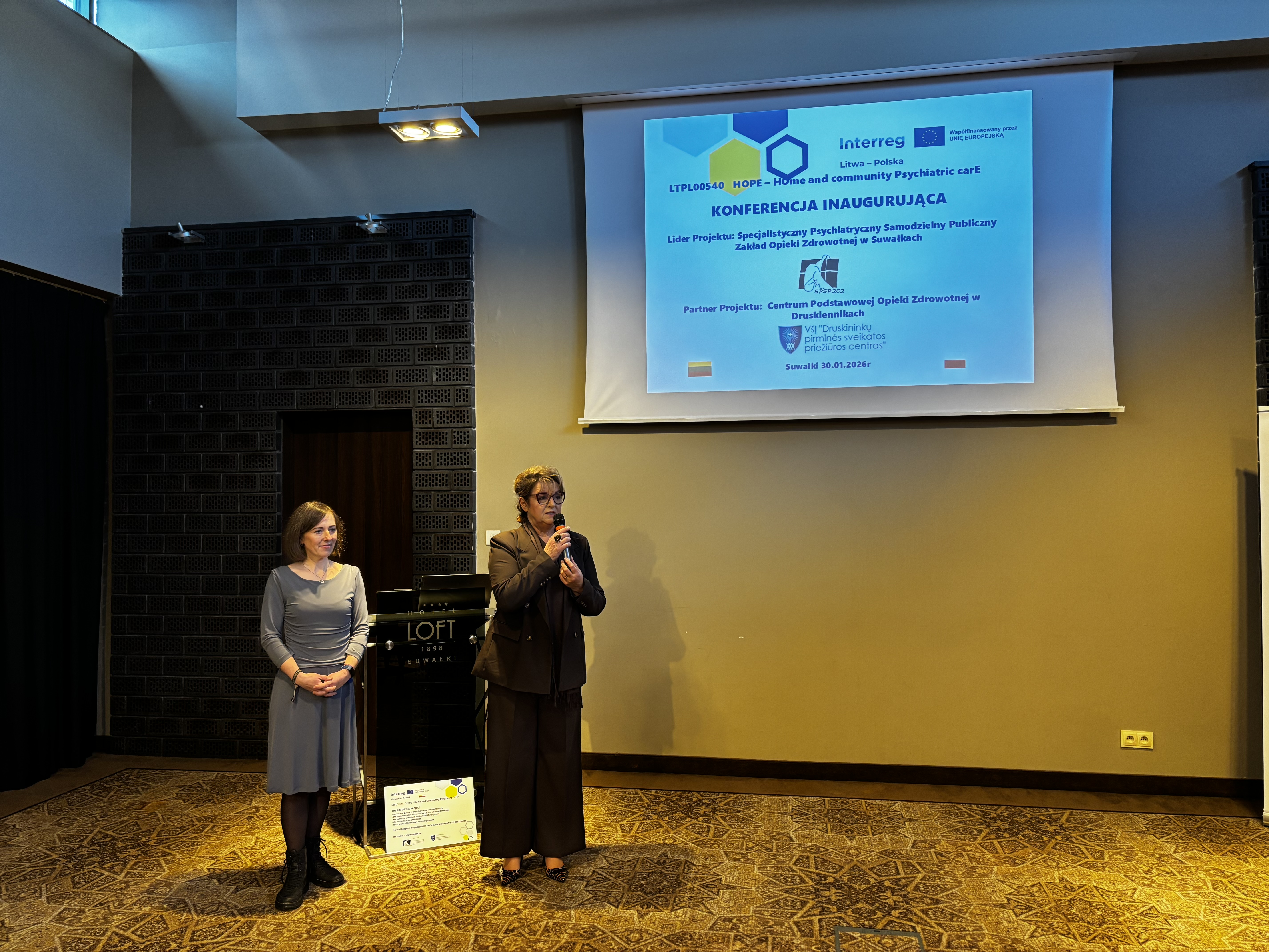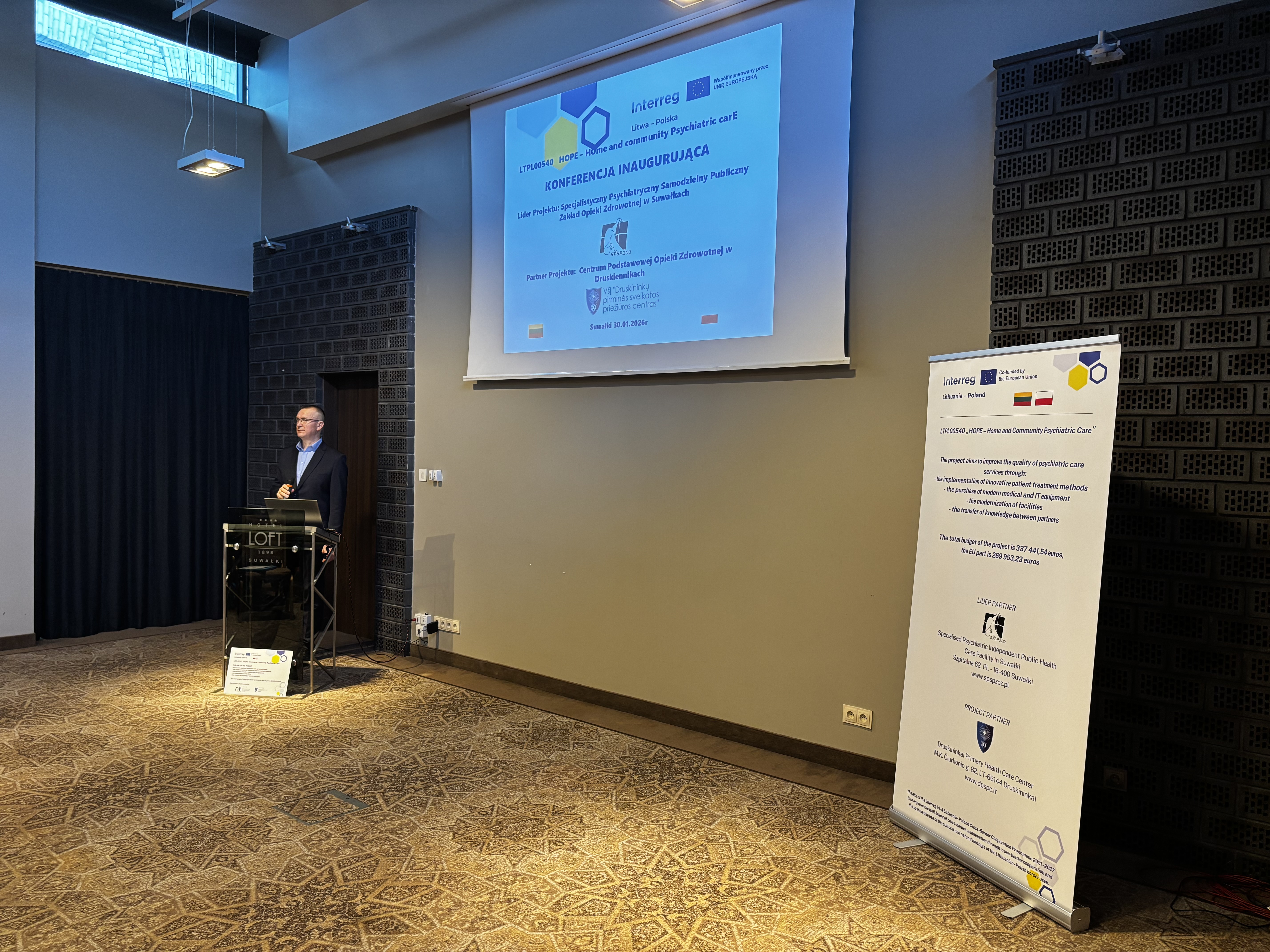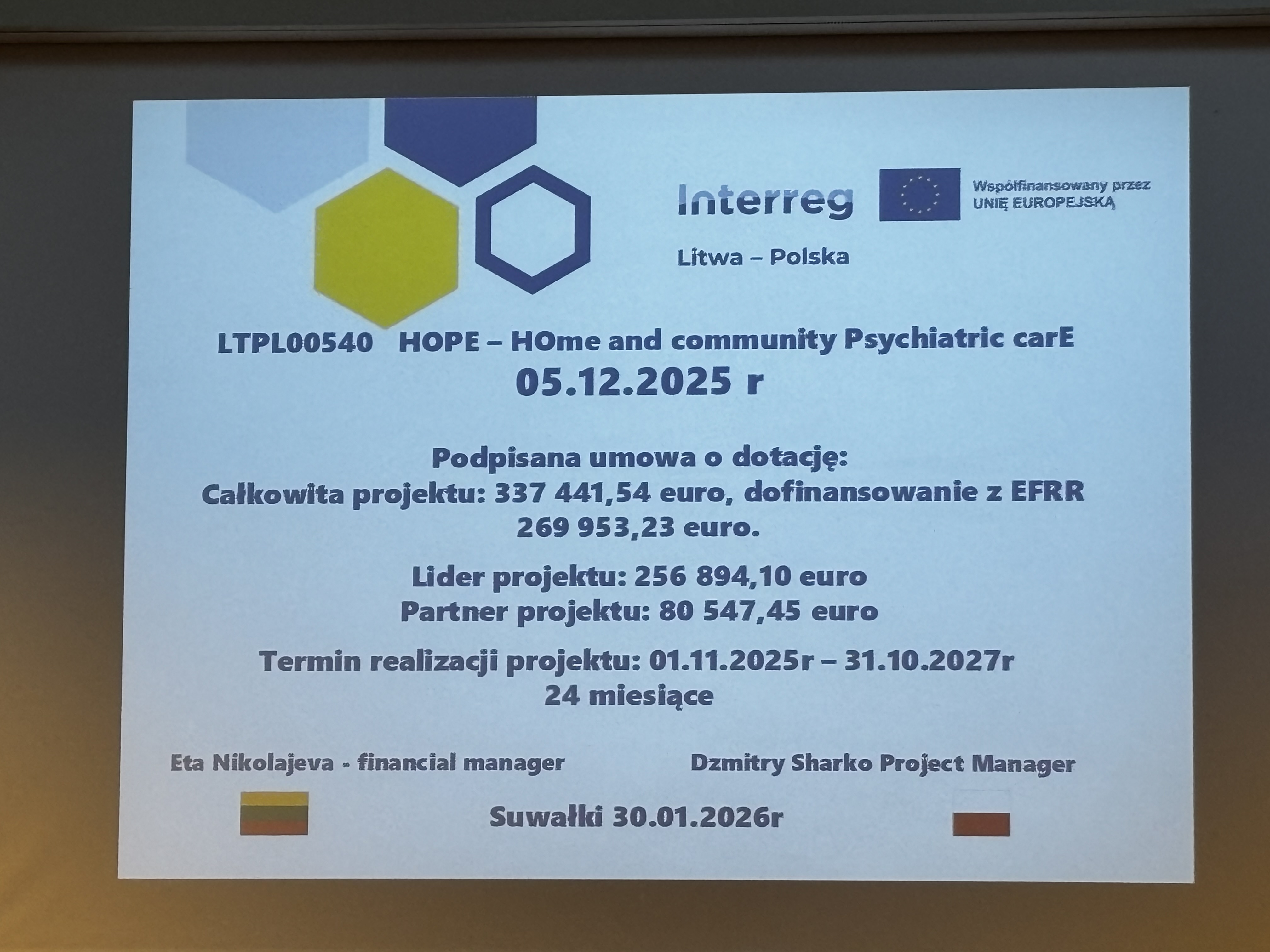 Projekt HOPE – HOme and community Psychiatric carE (Opieka psychiatryczna w domu i społeczności) realizowany jest przez Specjalistyczny Psychiatryczny Samodzielny Publiczny Zakład Opieki Zdrowotnej w Suwałkach oraz Publiczny Ośrodek Podstawowej Opieki Zdrowotnej w Druskienikach w ramach Programu Współpracy Transgranicznej Interreg VI-A Litwa-Polska 2021-2027. Całkowita wartość przedsięwzięcia to 337 441,54 euro, z czego dofinansowanie z Europejskiego Funduszu Rozwoju Regionalnego wynosi 269 953,23 euro. Realizacja potrwa od 1 listopada 2025 do 31 października 2027 roku.