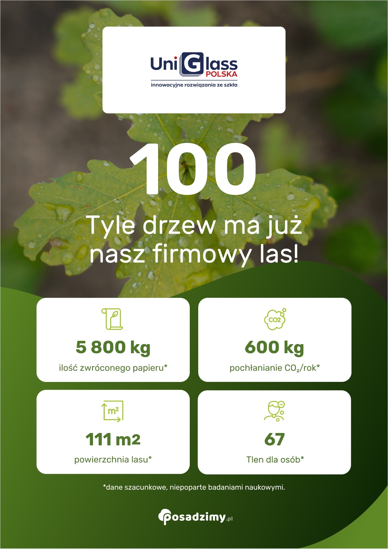 UniGlass Polska sp. z o.o., producent innowacyjnych rozwiązań ze szkła, posadziła 100 drzew we współpracy z platformą posadzimy.pl, realizując program odpowiedzialności ekologicznej. Inicjatywa stanowi element długofalowej strategii zrównoważonego rozwoju firmy i realnie wspiera redukcję śladu węglowego oraz odbudowę lokalnych ekosystemów.